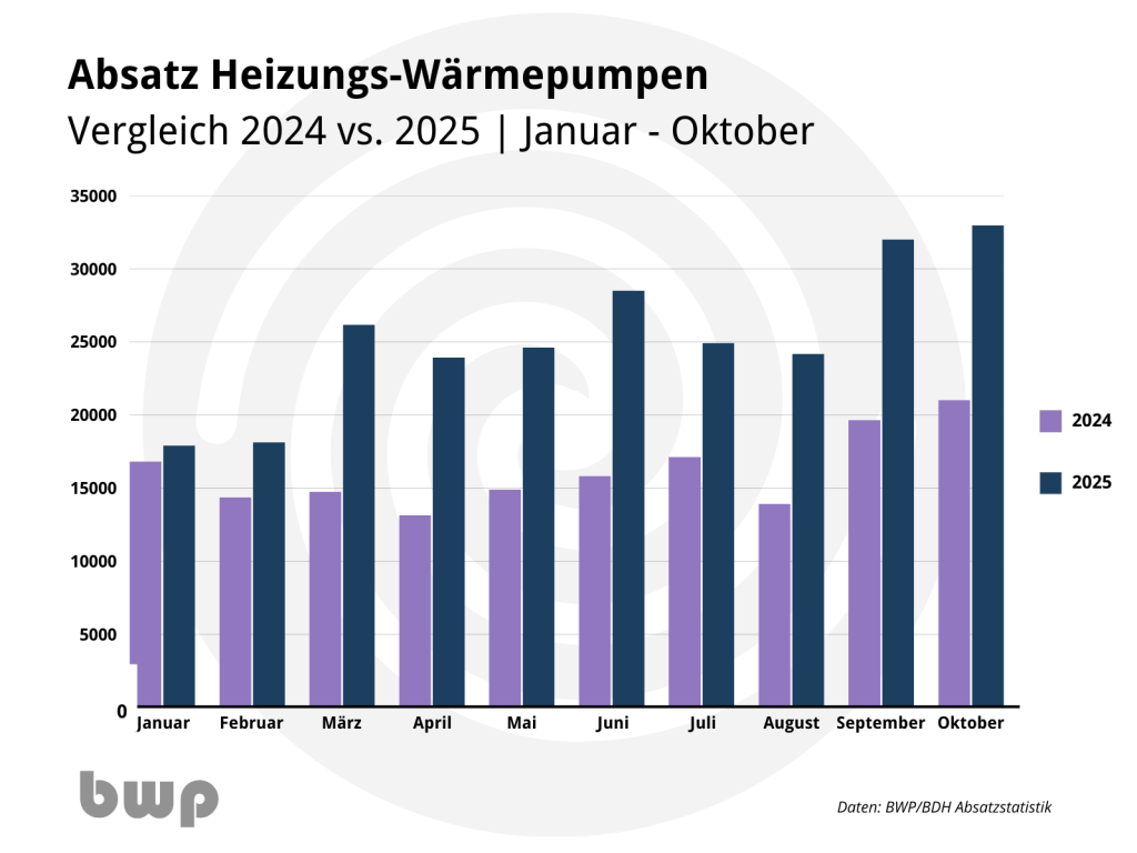 Seit März bewegen sich die Verkaufszahlen konstant um 25.000 Geräte pro Monat. Im September und Oktober wurden sogar mehr als 30.000 Wärmepumpen abgesetzt. Insgesamt liege der Absatz bis Oktober bereits bei rund 255.000 Geräten – ein Plus von 57 Prozent gegenüber dem Vorjahr. Der Wärmepumpenmarkt zeigt im Jahr 2025 demnach eine stabile und positive Dynamik.
