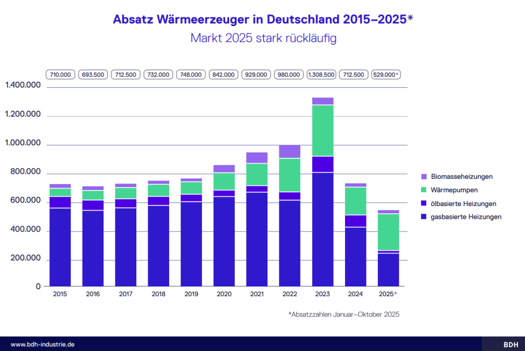 Erstmals war die Wärmepumpe in diesem Jahr auch das meistverkaufte Heizsystem auf dem deutschen Heizungsmarkt. Im Gegensatz zum Aufwärtstrend bei der Wärmepumpe ist der Heizungsmarkt insgesamt rückläufig. Von Januar bis Oktober wurden nur 529.000 Heizsysteme abgesetzt. Besonders öl- und gasbasierte Heizsysteme verlieren deutlich an Marktanteilen.
