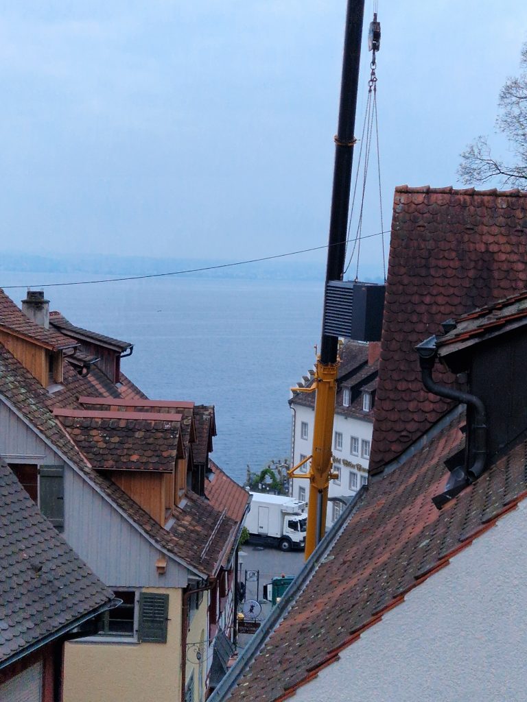 Ein weiteres denkmalgeschütztes Haus, diesmal ein Mehrfamilienhaus in der dicht bebauten Meersburger Altstadt, wurde im Rahmen einer Generalsanierung auf den Wärmepumpenbetrieb umgestellt. Hierbei war die größte Herausforderung der begrenzte Platz. Die Luft-Wasser-Wärmepumpe wurde mithilfe eines Autokrans über die Häuserzeile gehoben und neben dem Haus auf einen Felsen platziert.